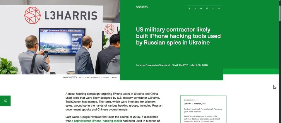 一週前Google威脅情報團隊(GTIG)揭露iOS漏洞利用工具包Coruna,並指出有人將其用於實際攻擊,分別是:間諜軟體公司的客戶、俄羅斯國家級駭客、以經濟利益為動機的駭客,同一天行動裝置安全公司iVerify也公布調查報告,提到此套件疑似來自開發間諜軟體的公司,本週科技新聞網站TechCrunch追蹤報導此事,指出該工具很可能來自美國國防承包商L3Harris。